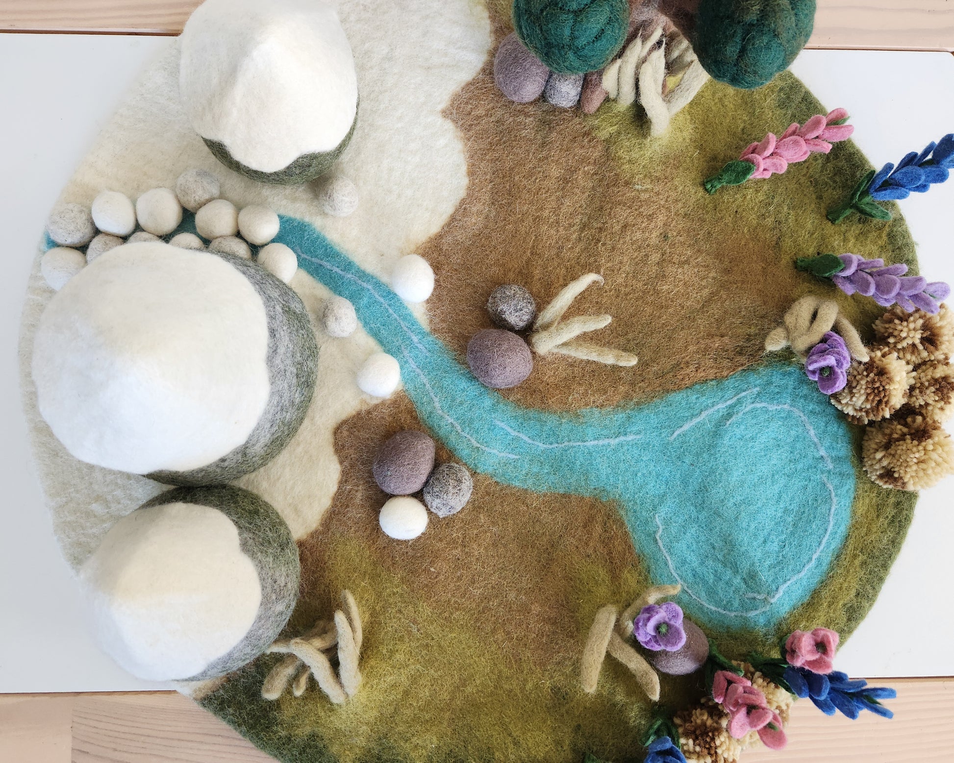 Step into the serene beauty of New Zealand’s Southern Alps with our Alpine Wonders Playscape, handmade in Nepal under fair trade conditions. Designed to inspire open ended storytelling and nature based play, this wool felt mat captures the charm of the alpine landscape. From glistening snowfields and icy blue glacial lakes to flower dotted valleys and golden tussock. It evokes the quiet magic of crisp mountain air and wide open alpine valleys.
