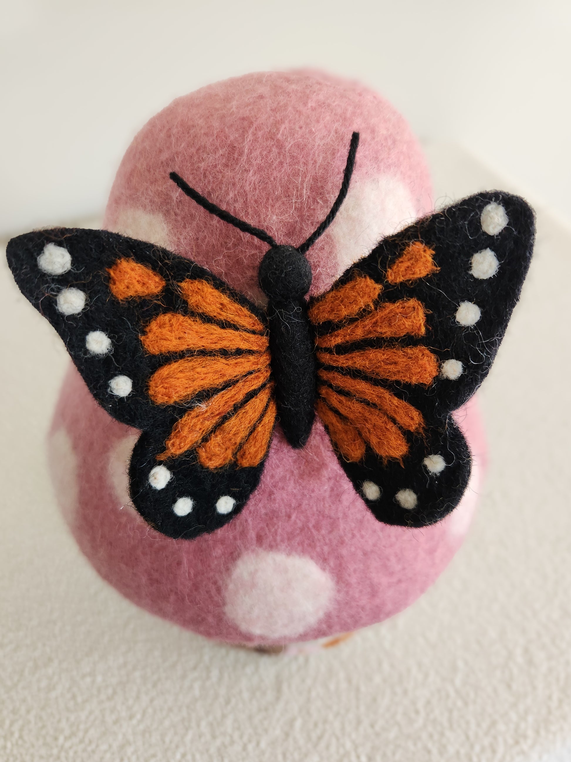 Nestled among moss and meadow blooms, is a gently speckled toadstool gnome home where forest luck is said to quietly linger. A delicate felt butterfly rests upon the blush pink roof above, lingering just long enough to share a whispered blessing before drifting on.