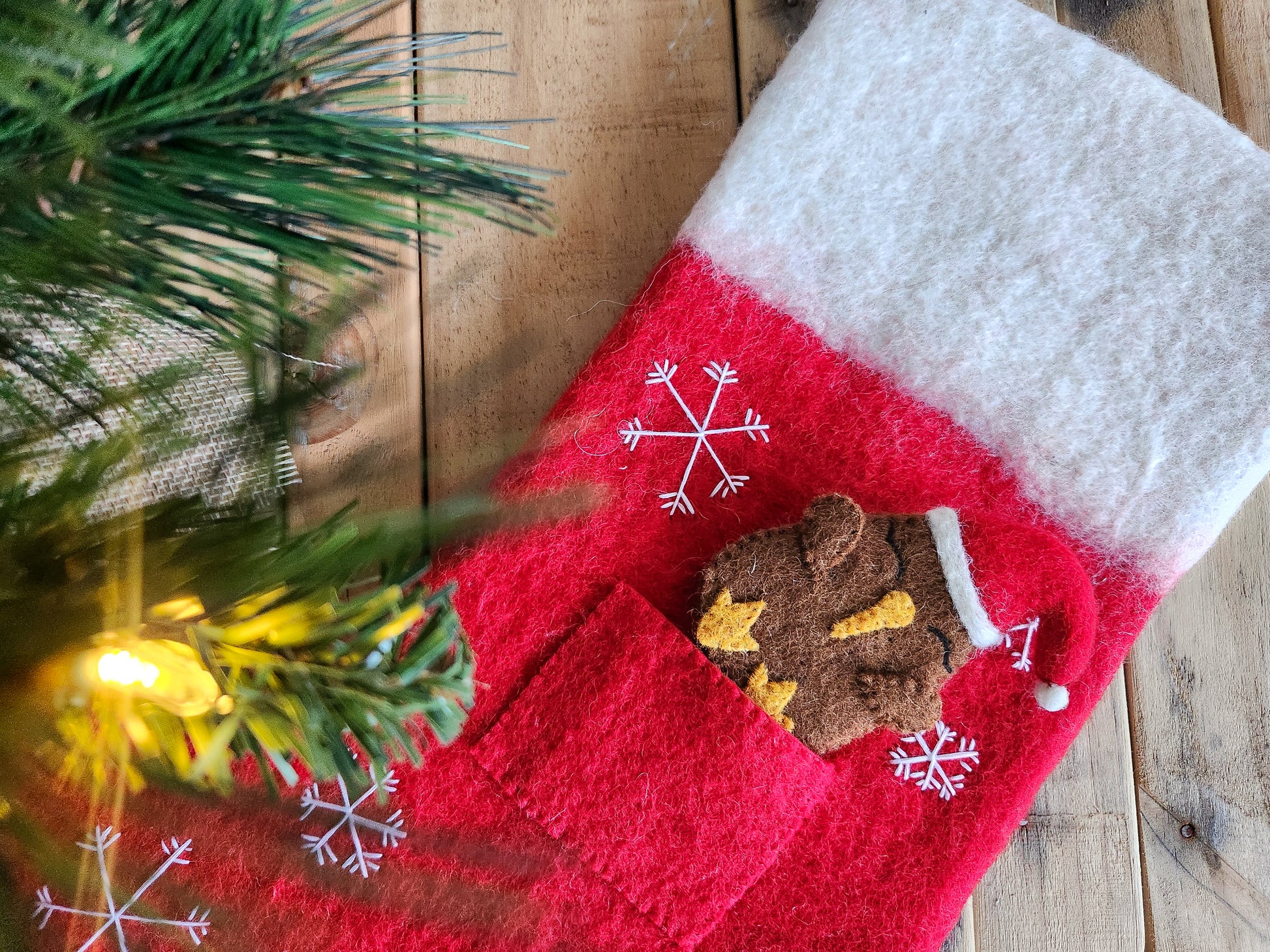 Felted with love, made from 100% wool, this timeless red and white stocking features intricate, hand-embroidered snowflakes that shimmer with festive charm.