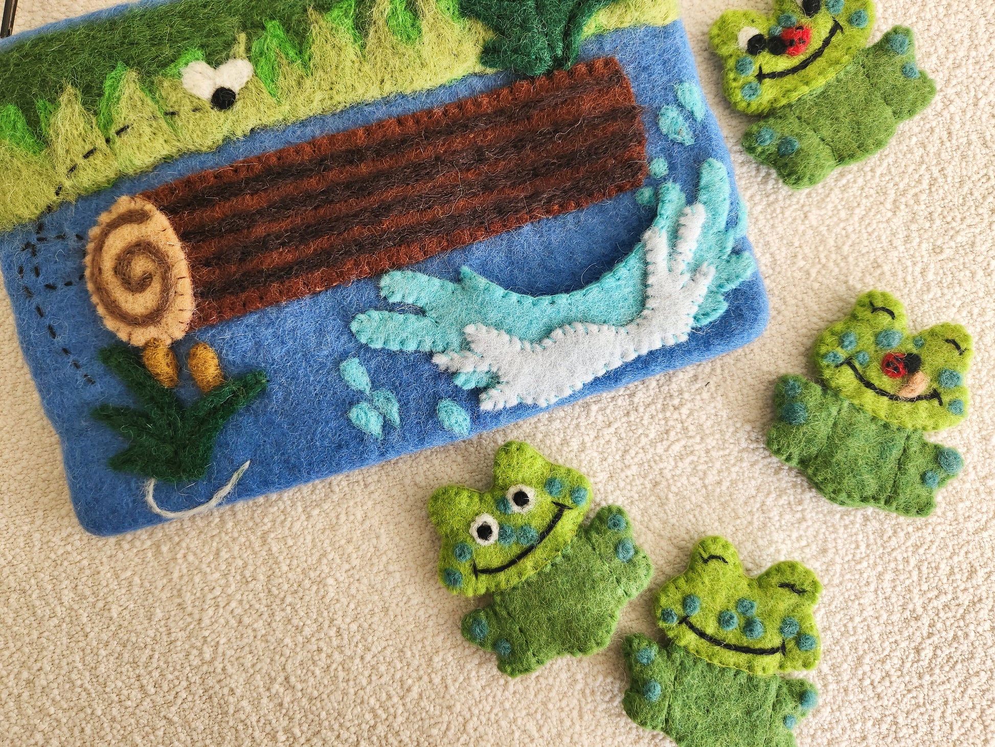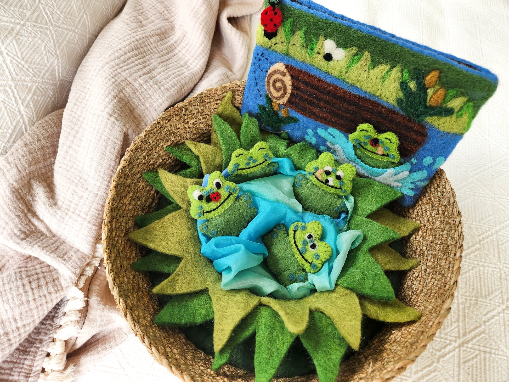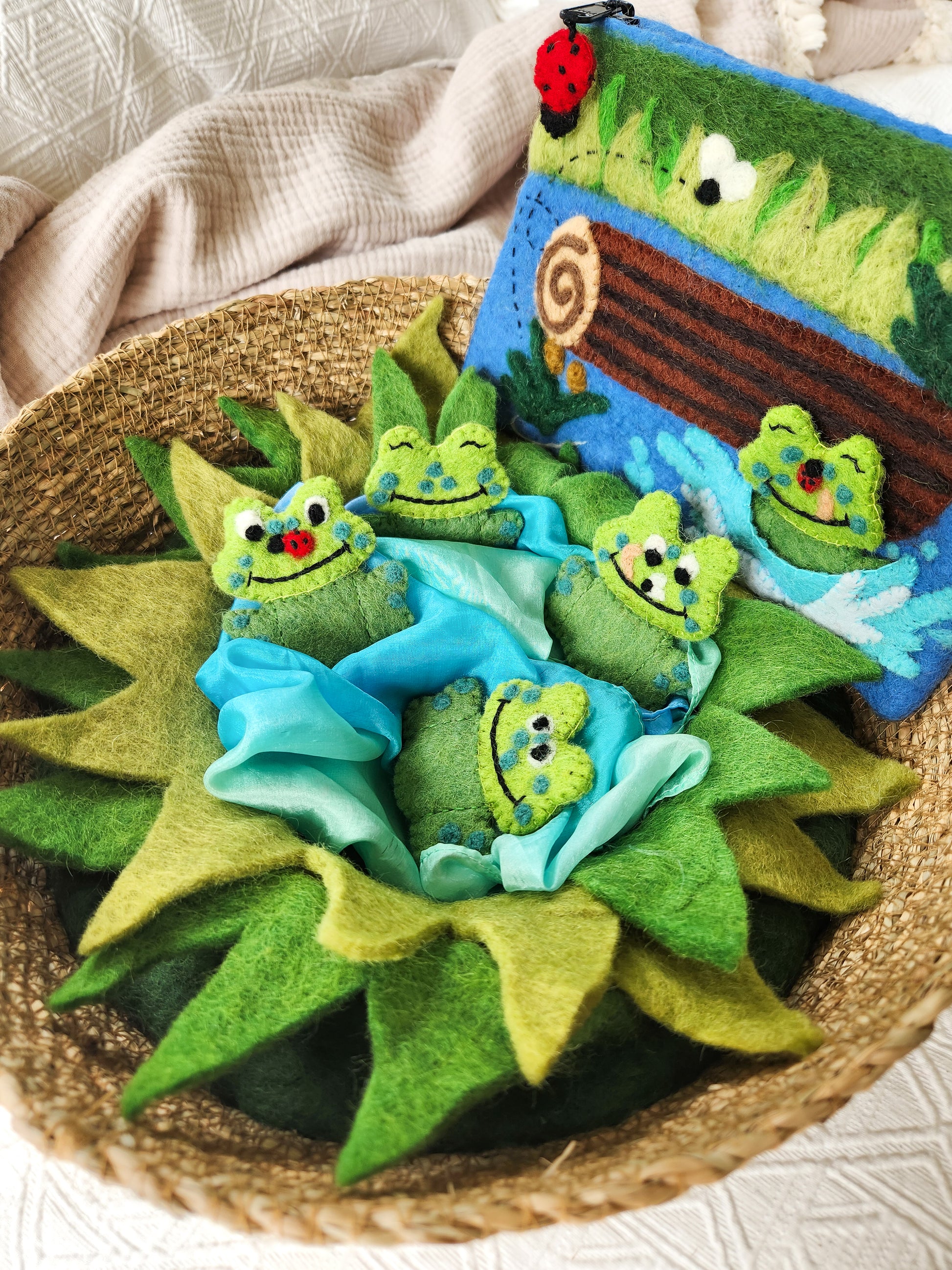 Let your little ones dive into their imagination with these hand-crafted wool felt finger puppets inspired by a classic nursery rhyme. These adorable Five Green Speckled Frogs come neatly stored in a charming pouch - perfect for storytelling on-the-go! Made with 100% wool and a soft cotton lining, these ribbit-ing puppets are sure to make a splash at rhyme time!